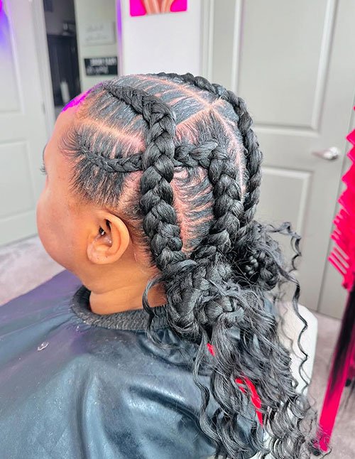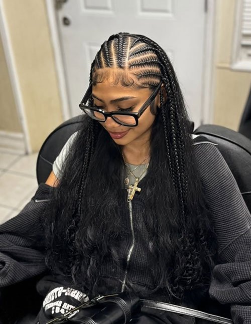 The contrast between tight braids and flowing curls creates visual depth and volume. Decorative beads or cuffs can further enhance its authentic Fulani aesthetic. It is a versatile protective hairstyle suitable for both casual and festive occasions.