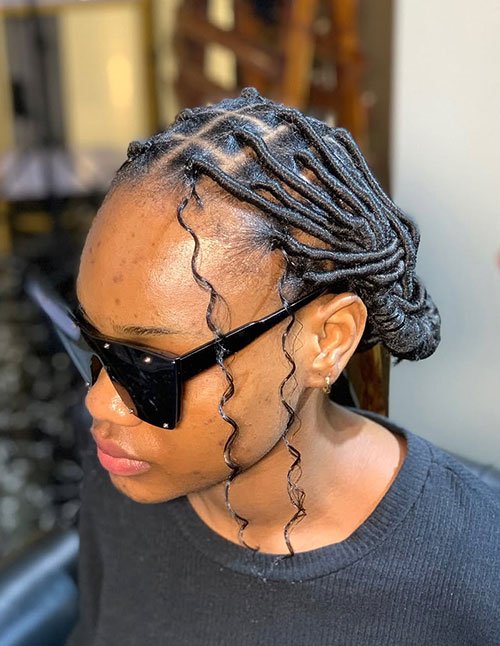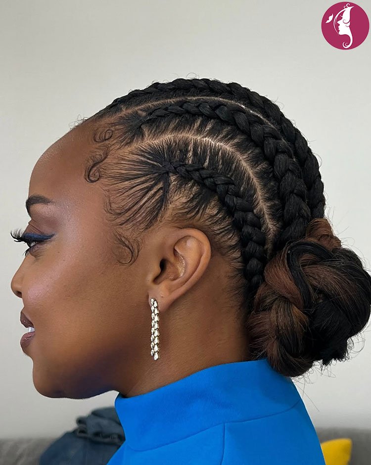 Striking and elegant, a high braided bun paired with curved cornrows creates a lifted, sculpted look. The curved patterns add dimension while the bun protects the ends of the hair. This hairstyle balances creativity with long-term hair protection.