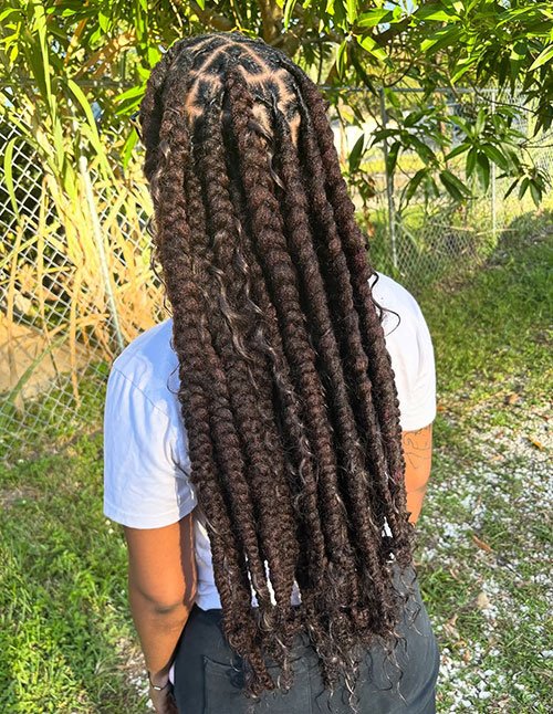 Invisible Loc Braids mimic natural locs using a distressed faux loc wrapping technique. The seamless installation creates the illusion of authentic grown locs. This style offers texture and dimension without permanent commitment.