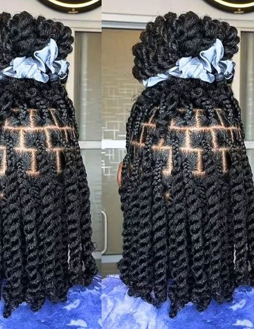 Geometric Parted Passion Twists combine defined square or triangular sections with soft twisted strands. The bold parting pattern enhances the structured base of the twists. This look pairs edgy design with flowing texture.