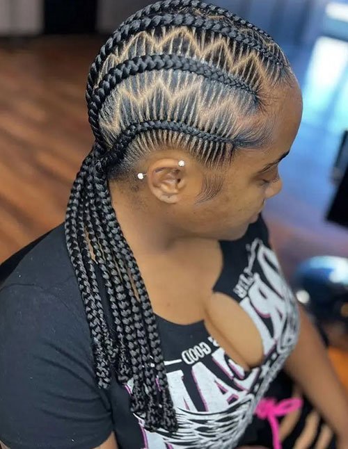 Zig-Zag Cornrows feature sharp angled braiding patterns that create a dynamic scalp design. The alternating direction adds depth and visual contrast to traditional cornrows. This style stands out for its precision and bold structure.