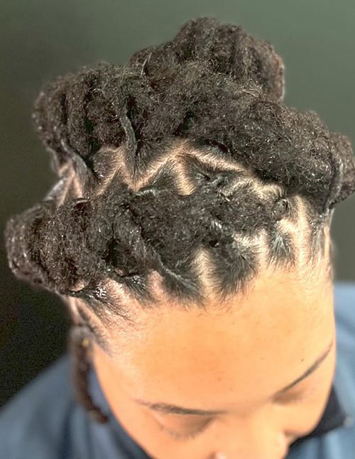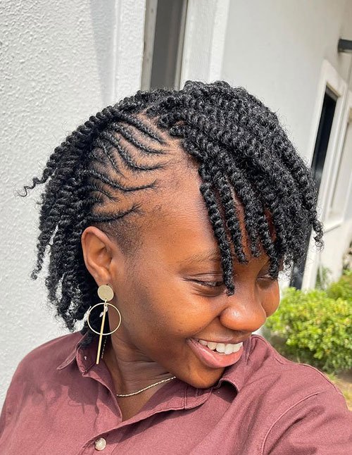 Kinky Twist Side Mohawk showcases textured twists styled upward along one side of the head. The shaved or slicked side enhances the dramatic mohawk silhouette. This bold look celebrates volume and natural texture.