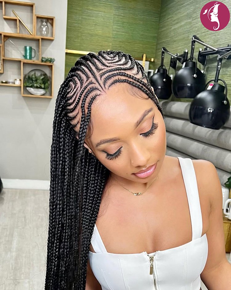 The neat feed-in technique keeps the braids flat and scalp-friendly while maintaining long-lasting hold. Its symmetrical detailing makes it perfect for statement looks and special occasions. This protective style is both fashionable and low-maintenance for everyday wear.