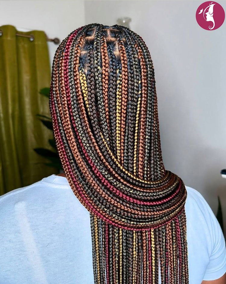 Bold and expressive, long multicolor feed-in braids allow women to experiment with color while keeping their natural hair protected. The feed-in technique ensures a natural start at the scalp and reduces tension. This style is perfect for those who want a statement look without damaging their hair.