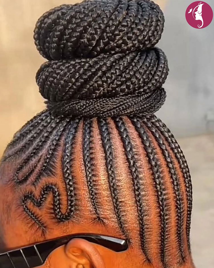 High Braided Bun with Curved Cornrows