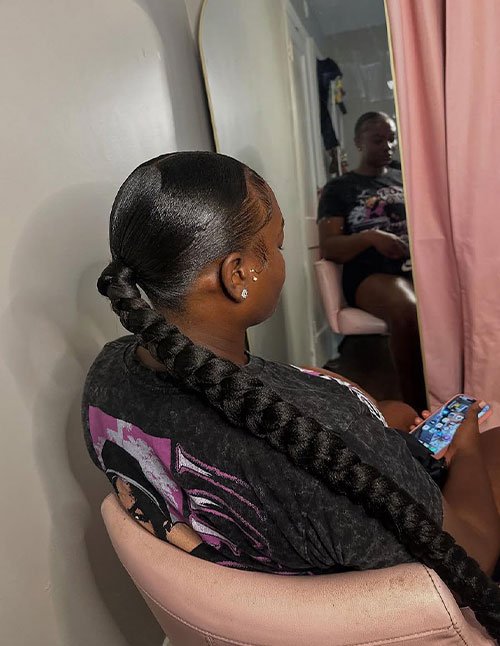 Extra-Long Slick Back Braided Ponytail combines sleek feed-in cornrows with a dramatic extended ponytail finish. The slicked edges enhance the polished appearance while keeping the scalp smooth and defined. This style delivers a bold, high-impact look with a clean professional vibe.
