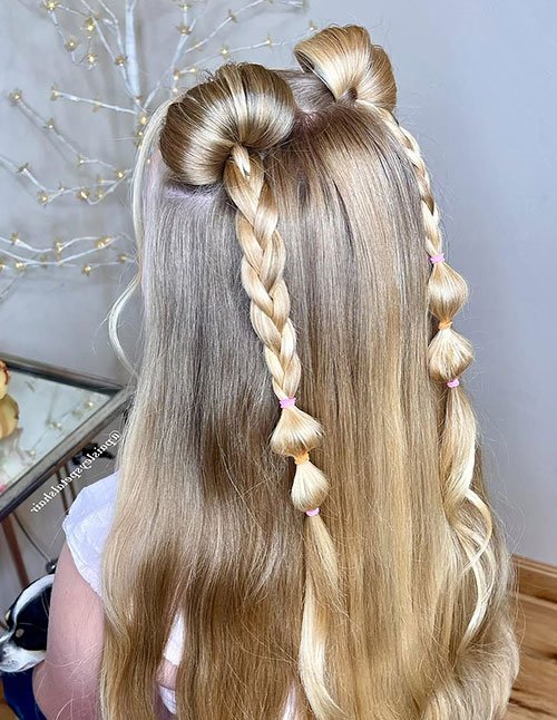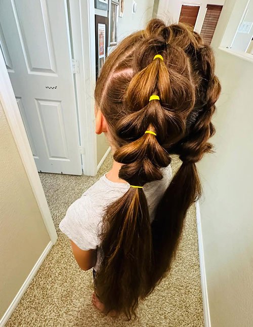 Bubble pigtails are basically the fun cousin of classic braids. Instead of weaving strands, you section the hair with elastics and “puff” each part for volume. They’re amazing for thicker hair, but even fine hair can fake fullness with a texturizing spray.