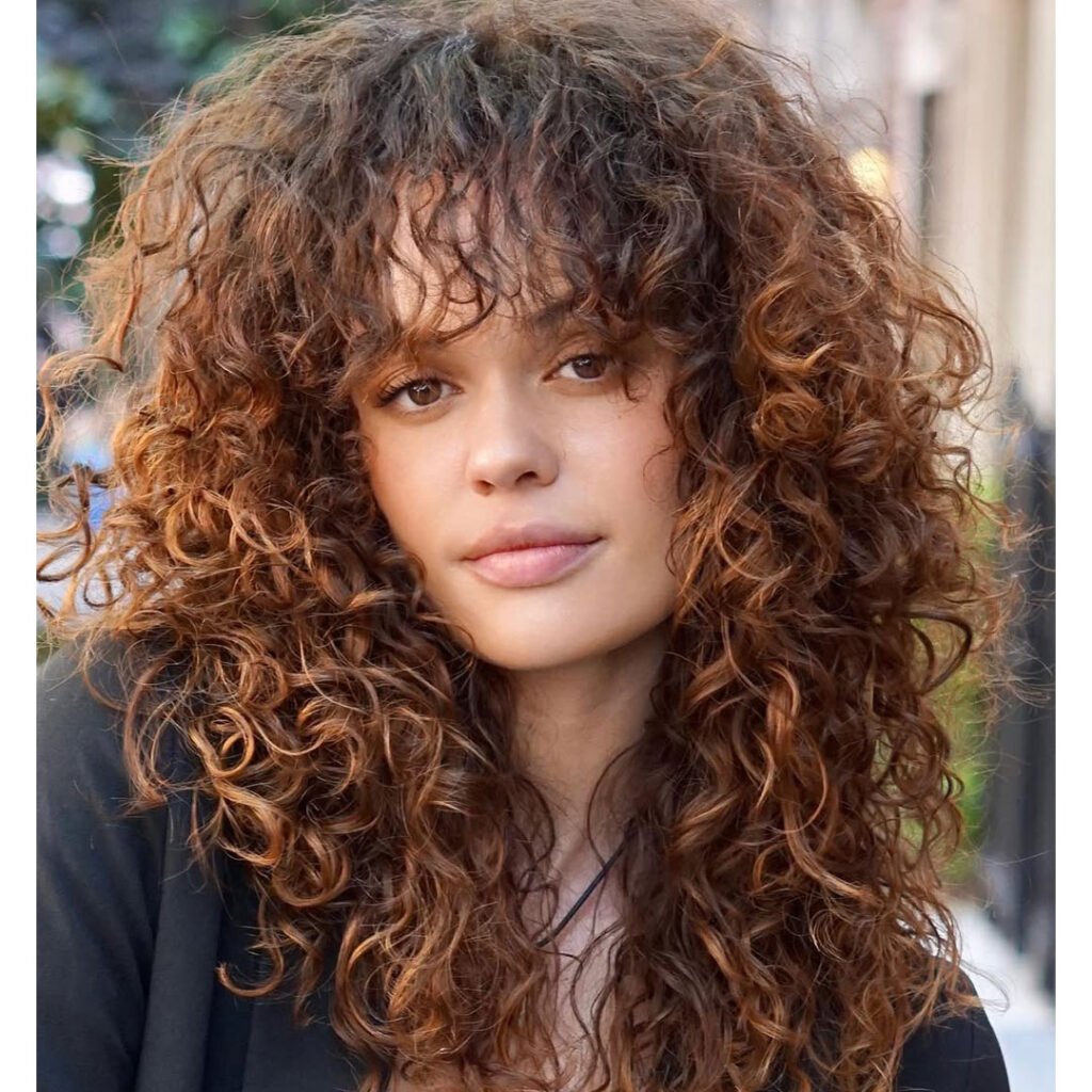 Natural curls get a stylish update with this layered wolf cut. The brown highlights add depth and make each curl stand out beautifully, while the bangs frame the face and add a playful touch.