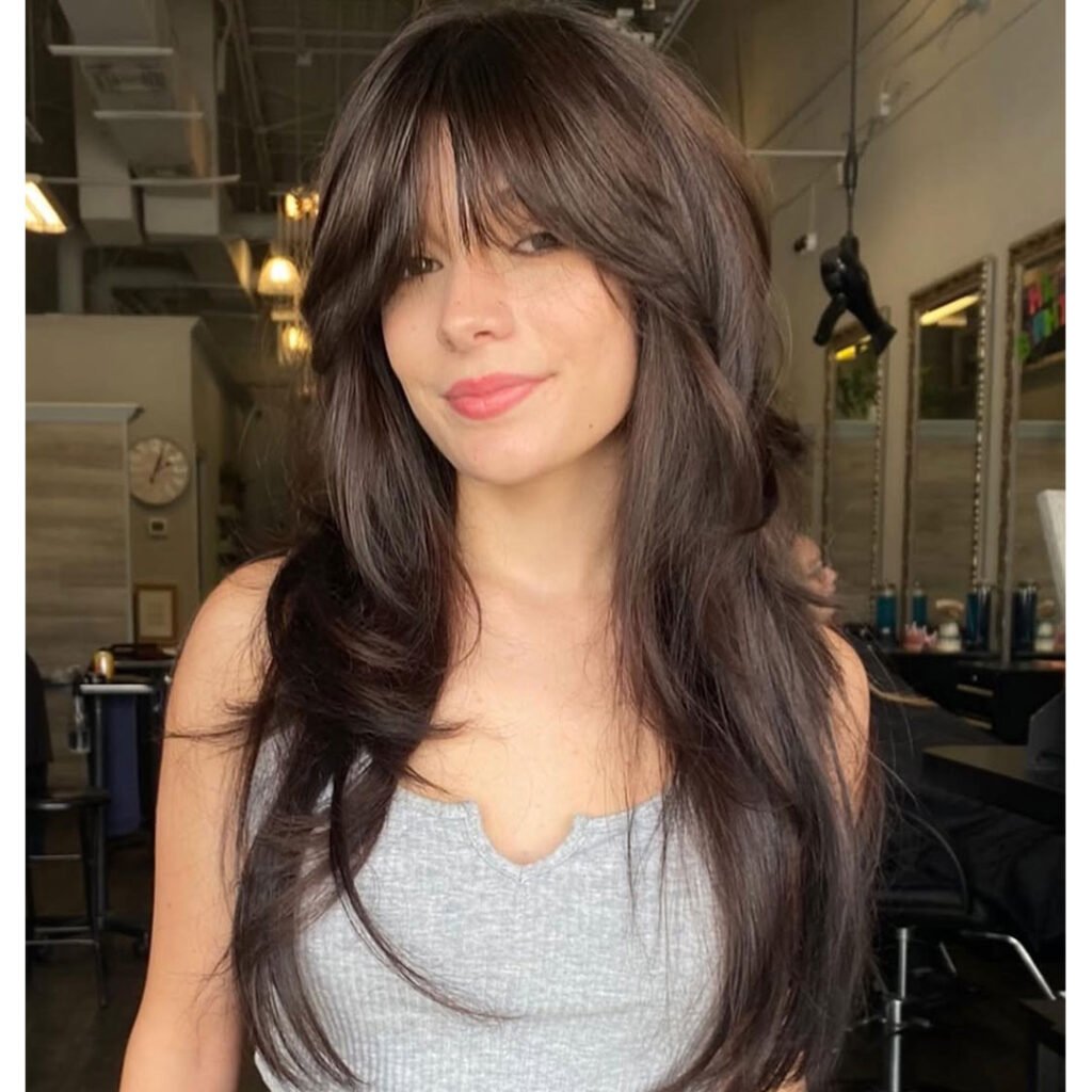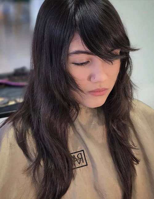 Long hair lovers, rejoice — this wolf cut lets you keep your length while still enjoying that trendy layered texture. The curtain bangs add softness and frame your face beautifully, blending into cascading layers that start high at the crown.