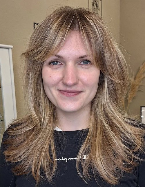 The bangs gently kiss the eyebrows, adding youthfulness without overwhelming the face. Medium layers create a beautiful flow, adding movement and body without losing control. This cut is especially flattering on round or oval faces, as it softly frames the features.