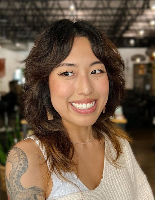 Effortless texture meets controlled layering in this medium-length wolf cut designed for natural movement. Soft waves emphasize dimension and help the layers blend seamlessly from crown to ends. The result is a relaxed yet structured hairstyle that looks polished without stiffness.