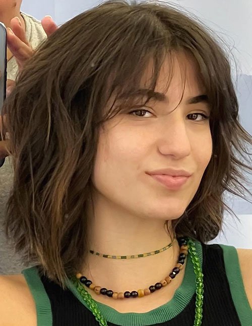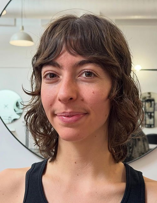Blending bob structure with wolf cut layering creates a modern hybrid that feels fresh and lightweight. The wispy fringe softens the overall look while maintaining playful texture around the face. This shorter version emphasizes movement without overwhelming facial features.