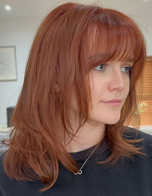 Warm copper tones enhance the layered structure, making each section of the wolf cut more dimensional. The fringe softens the forehead area while complementing the airy texture throughout the hair. Color and cut work together to create depth and visual movement.