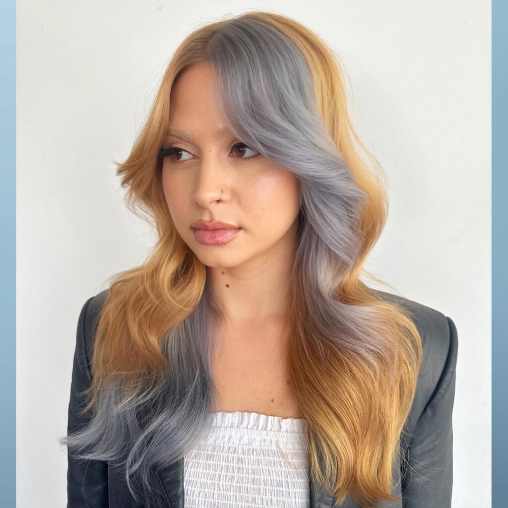 This color pairing works year-round but feels especially fresh in cooler months, when silver tones really pop. Add soft curls for a glamorous touch or leave it straight for a sleek, editorial vibe.