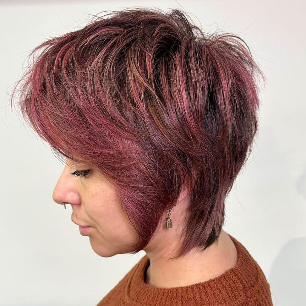 For those who want just a hint of boldness, plum highlights on a short layered wolf cut are the perfect choice. The deep, jewel-toned purple peeks out between layers, offering a sophisticated twist on vibrant color.