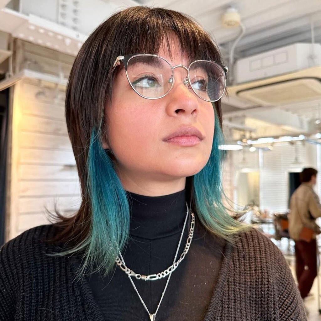Peekaboo color is the ultimate low-commitment way to try something bold, and this wolf cut with teal streaks hidden underneath is proof. At first glance, it’s subtle — but flip your hair or tie it up, and the teal makes a striking appearance.