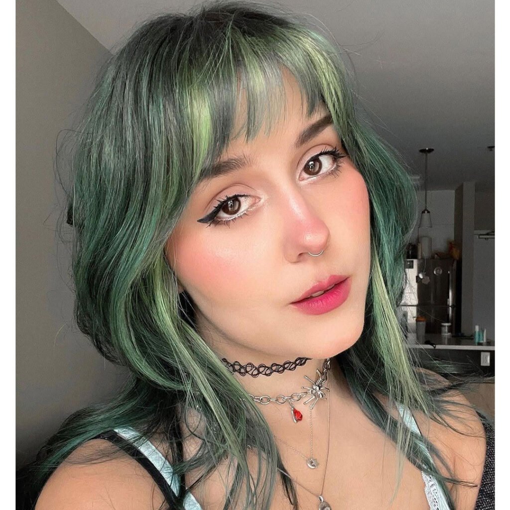 The shaggy texture of the wolf cut keeps the color from feeling too heavy, giving it a fun, rockstar edge. Every layer catches the light differently, so the green feels dynamic rather than flat.