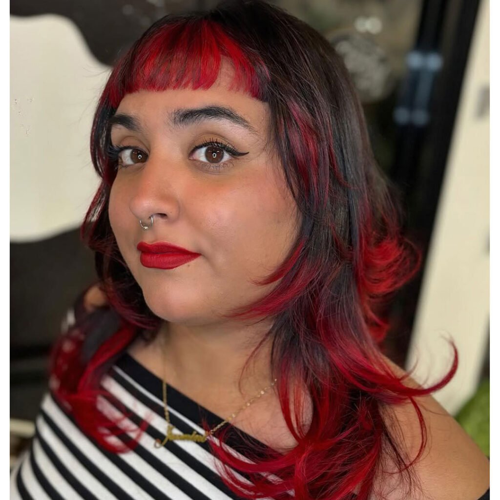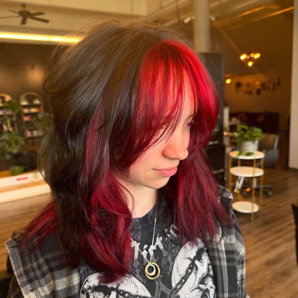 Panel highlights are a bold way to add color, and this black wolf cut with fiery red sections is pure rockstar energy. The red panels peek through the layers, creating drama and depth with every movement.