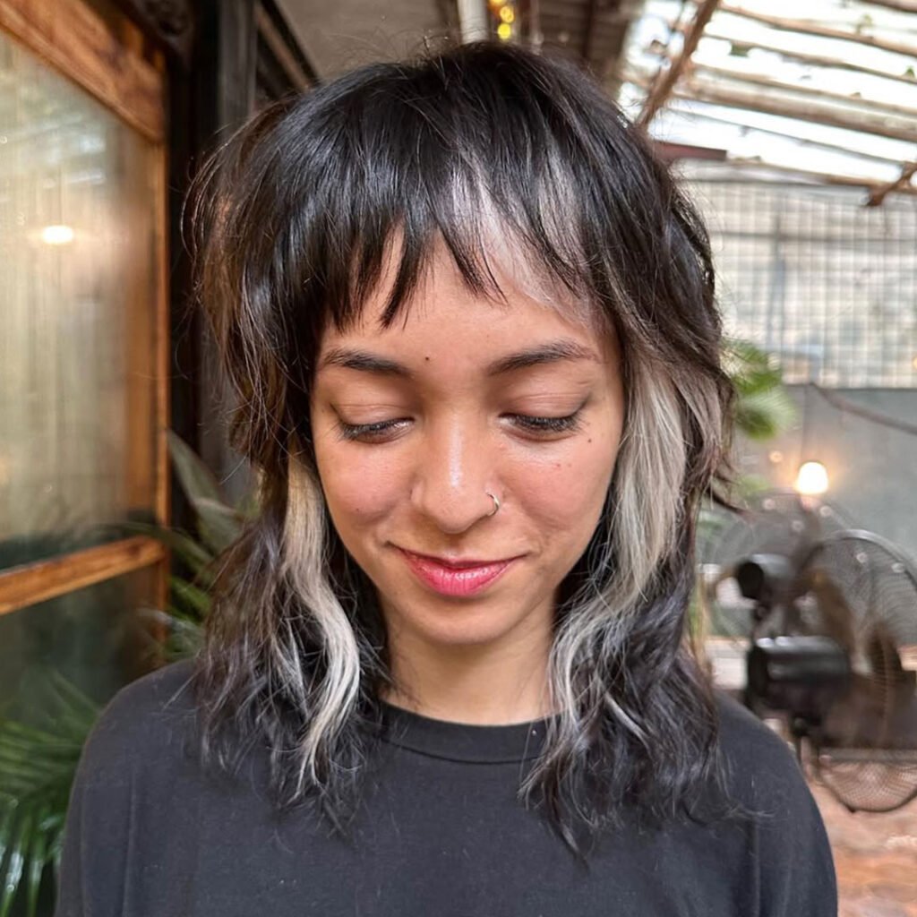 The “money piece” trend isn’t going anywhere, and this black wolf cut with silver framing highlights is a striking example. The icy silver strands at the front instantly brighten the face while cutting a modern edge.