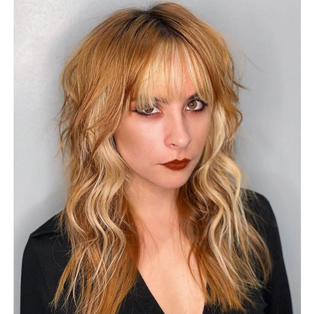 Sun-kissed and effortlessly chic, this golden blonde wolf cut is made even brighter with lighter blonde streaks around the face. It’s the perfect style for adding dimension without a full color overhaul.