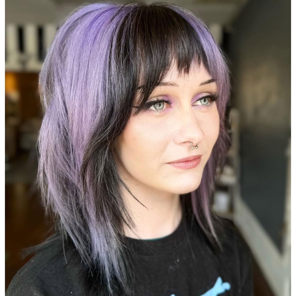Soft meets edgy in this black wolf cut with lavender ombre. The transition from deep black to pastel purple creates a beautiful gradient that’s eye-catching yet elegant.