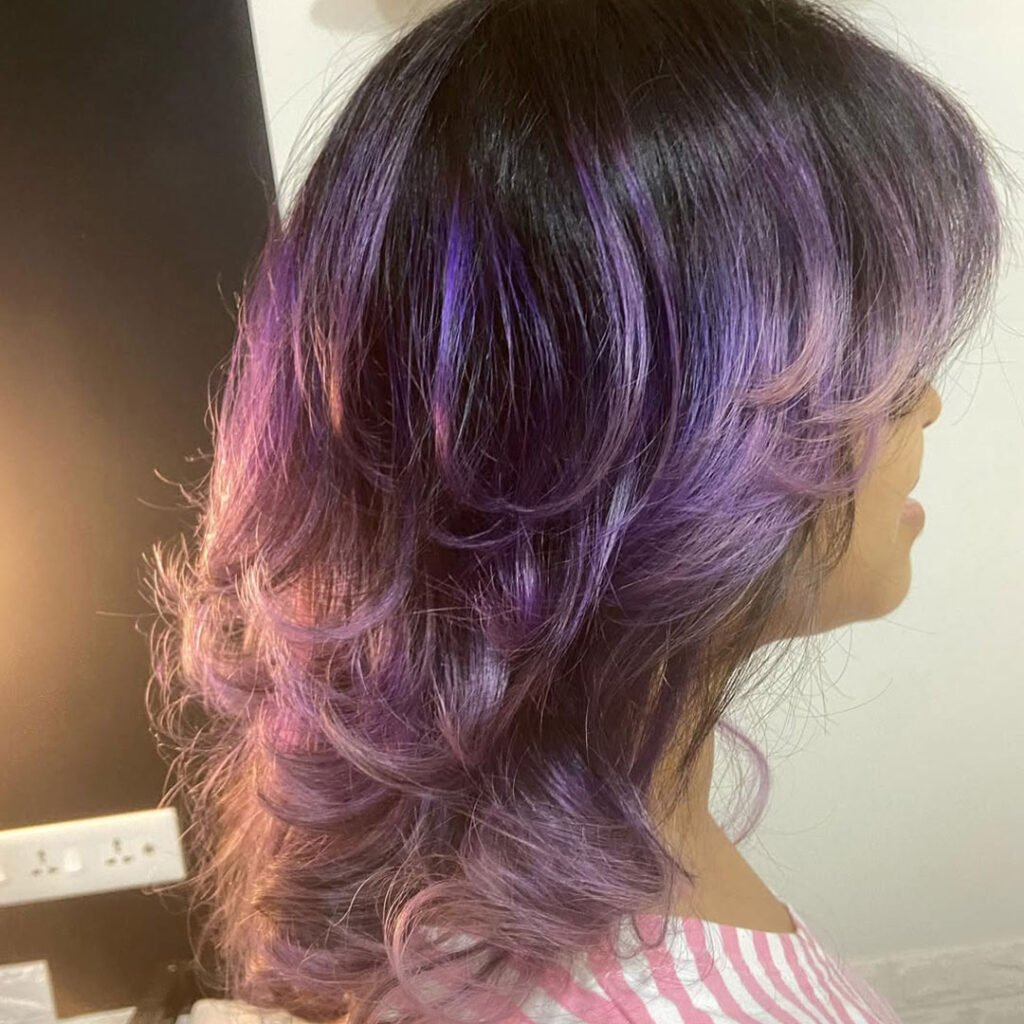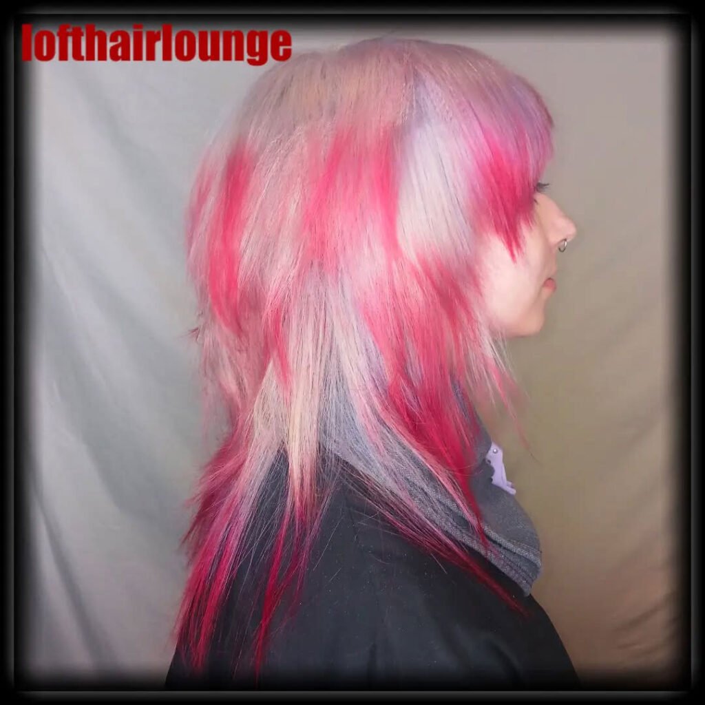 Soft yet vibrant, this wolf cut flows from candy-pink roots into rich purple ends, creating a dreamy gradient effect. It’s a style that balances sweetness with edge, perfect for anyone wanting a romantic yet bold look.