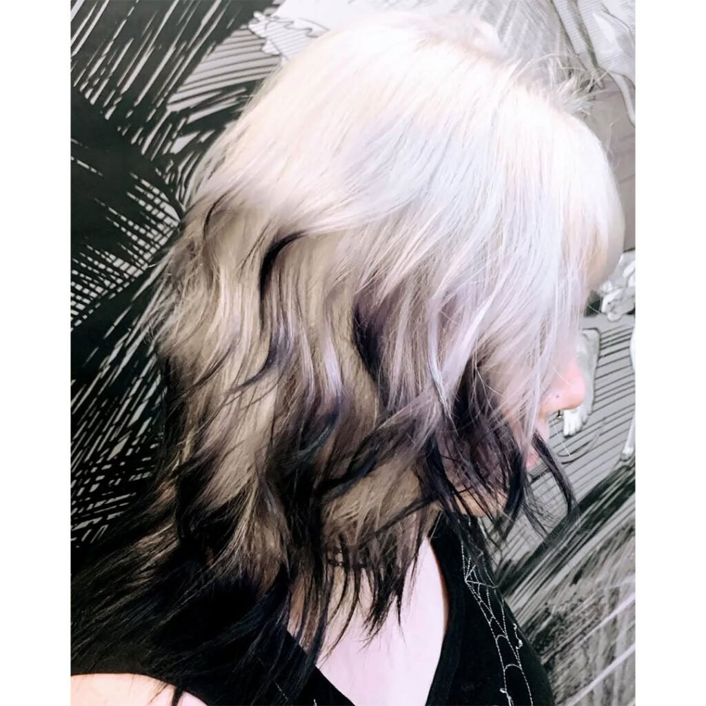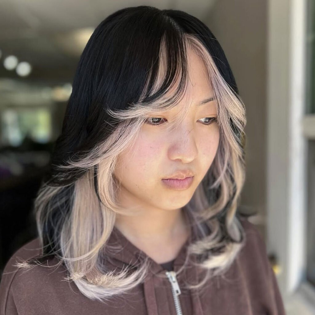 Popular color combos include black with platinum blonde or vivid streaks like pink, green, or blue. The result is a playful, rebellious look that’s rooted in internet culture but elevated with a professional cut.