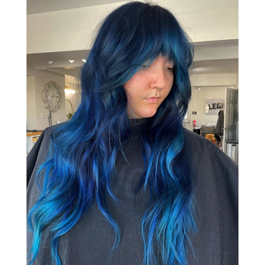Sometimes, a hint of color at the ends is all it takes to transform a hairstyle. This long wolf cut starts with natural roots and fades into mesmerizing blue ombre tips that feel fresh and youthful.
