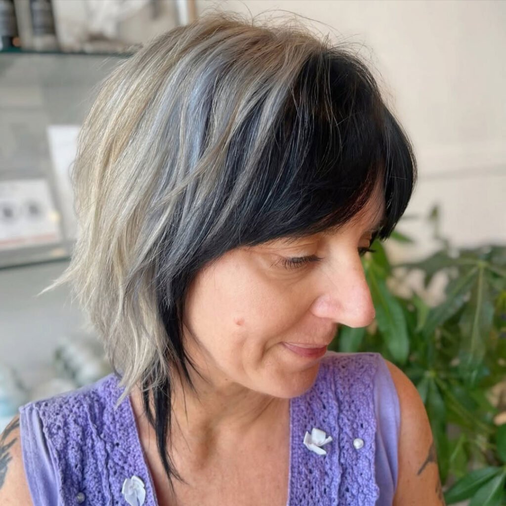 Here’s proof that short hair can be just as dramatic as long styles. This short wolf cut features a deep black crown that melts into shimmering silver ends, creating instant depth and definition.
