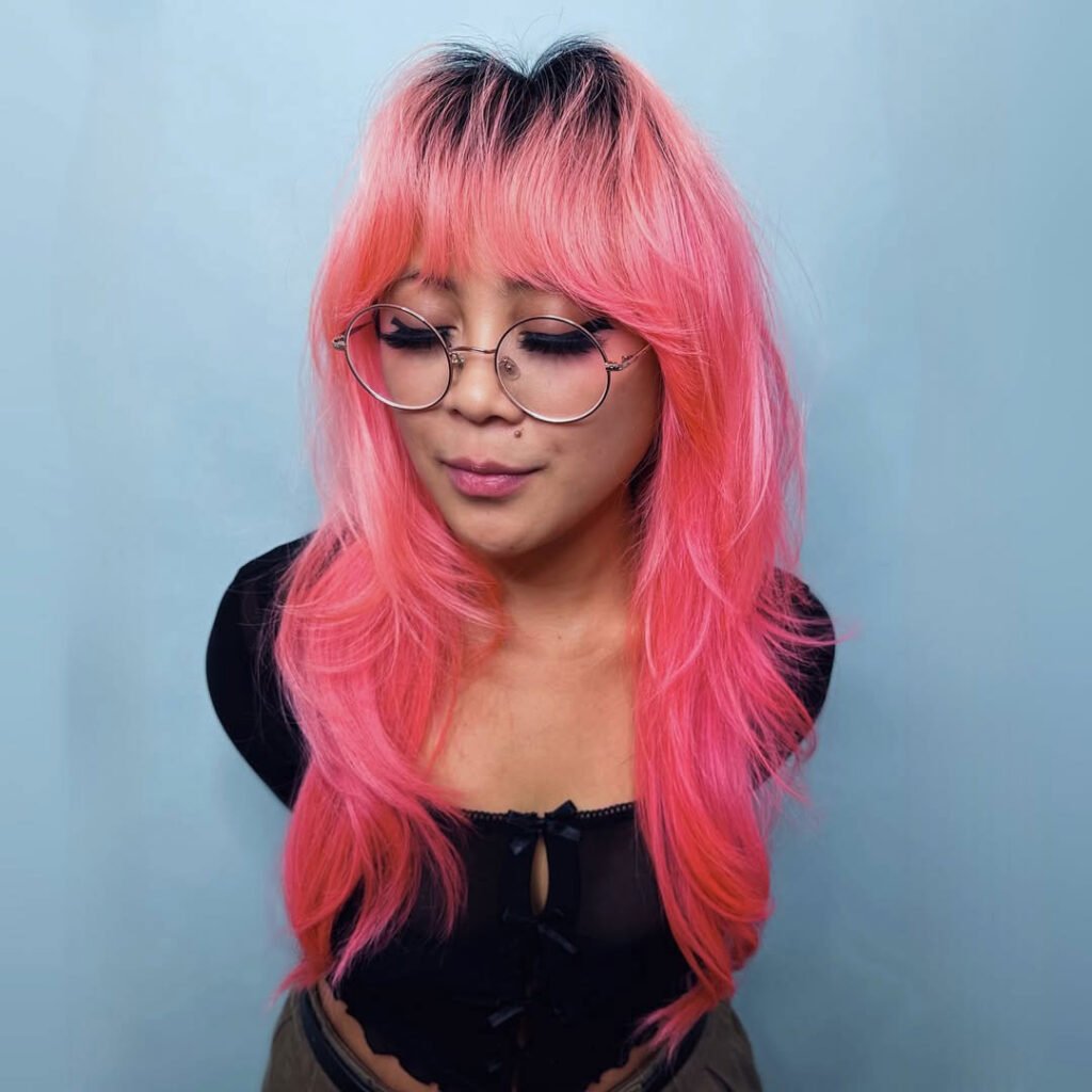 The wolf cut’s layers keep the color from feeling flat, adding movement so the pink looks fresh from every angle. This is the kind of style that pairs beautifully with casual denim as well as dressed-up outfits.
