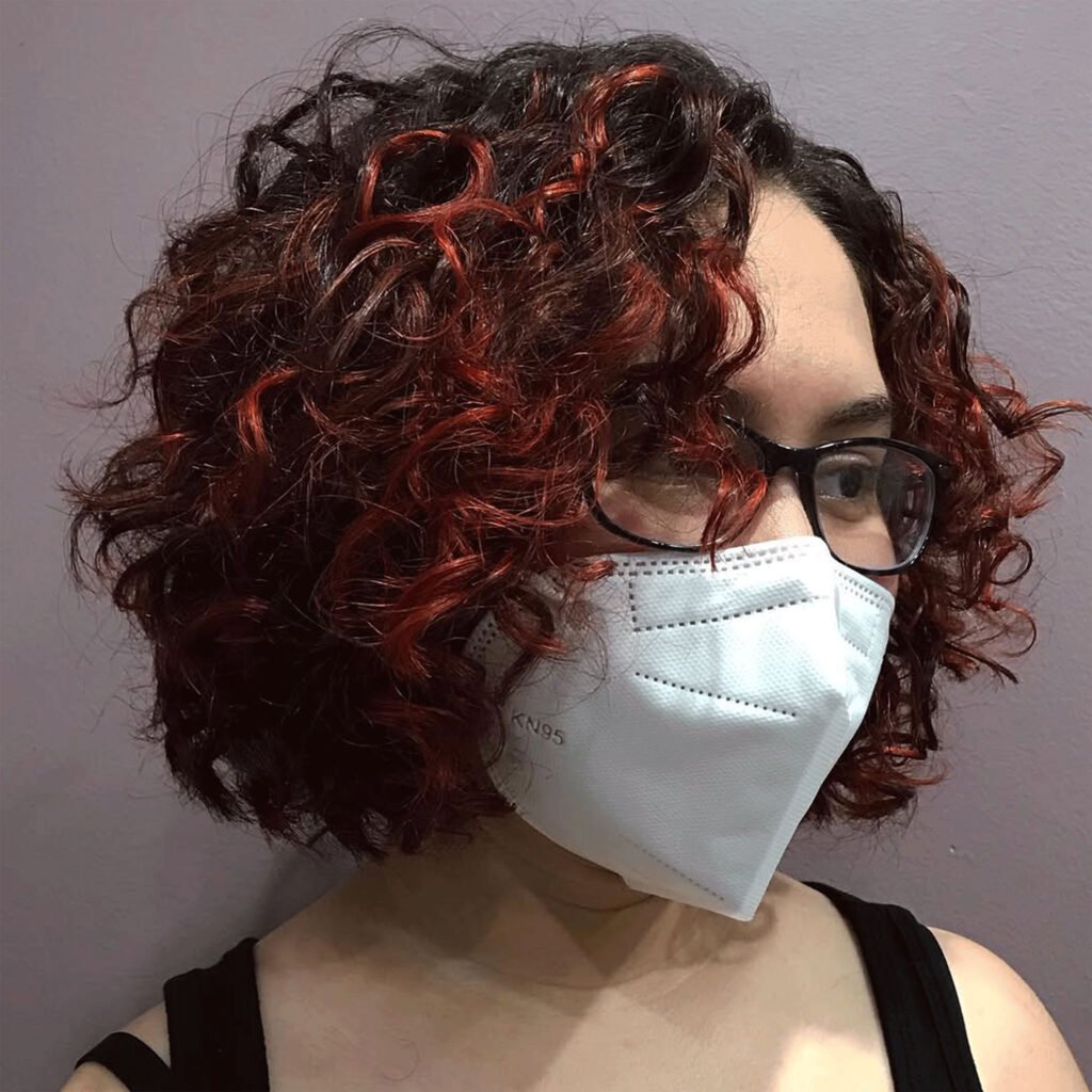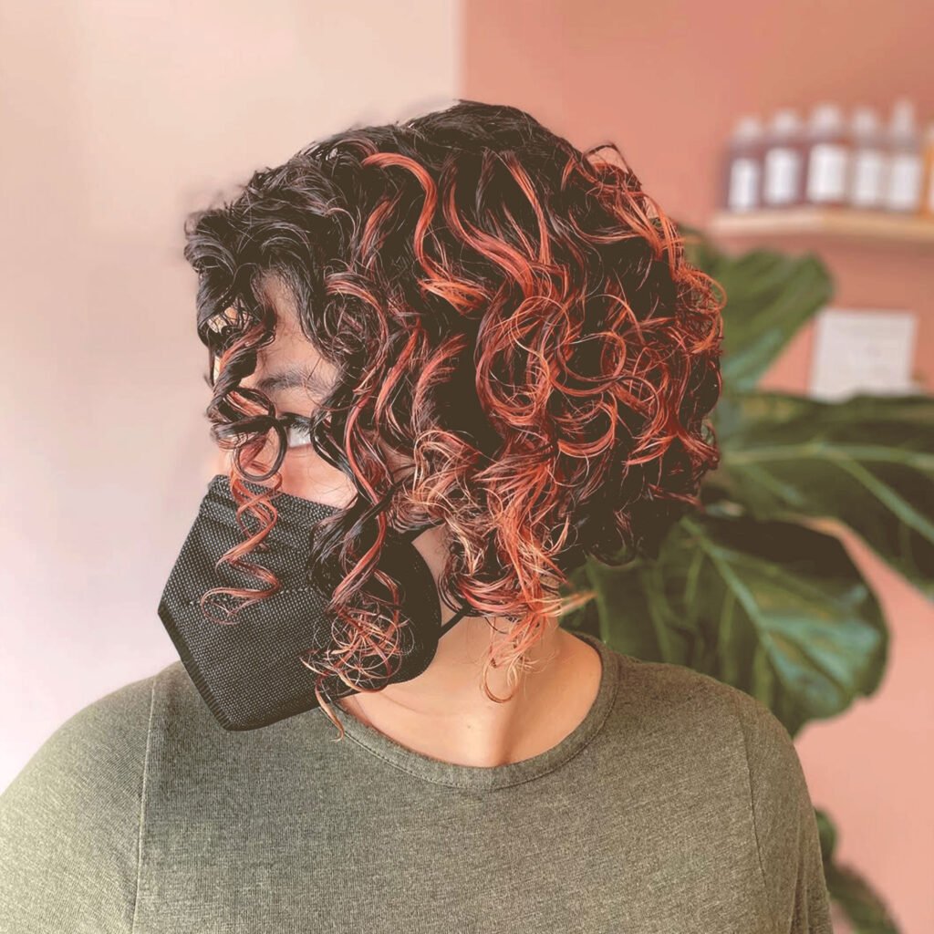 This hairstyle adds fiery red highlights that bring depth and brightness to curls. The bob length keeps it easy to style while still full of bounce.