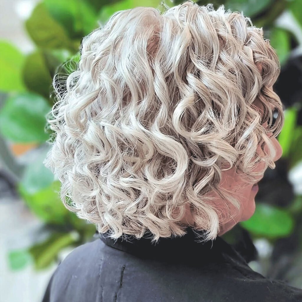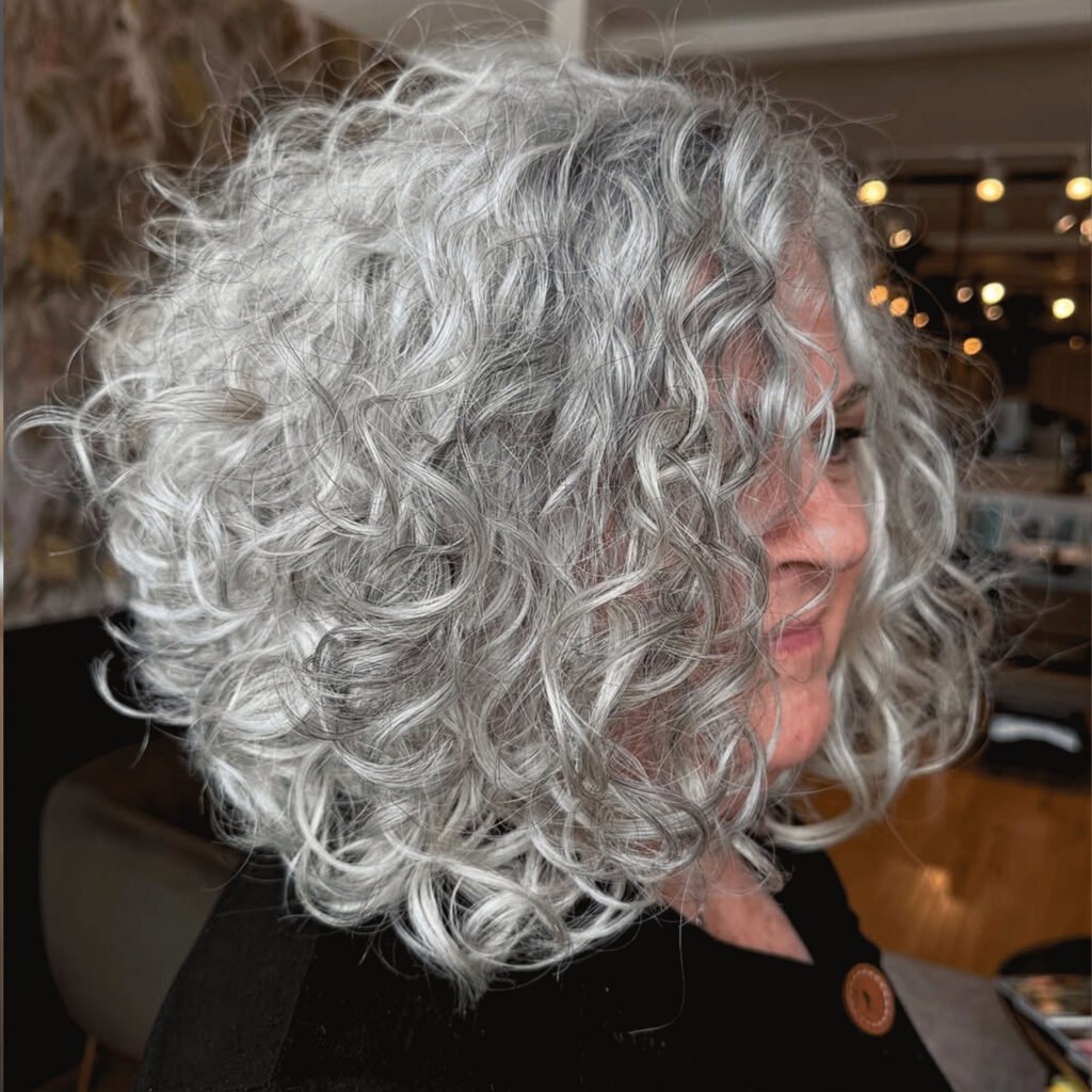 This bob shines with a unique silver tone that highlights the bounce of each curl. The color feels modern, trendy, and elegant.