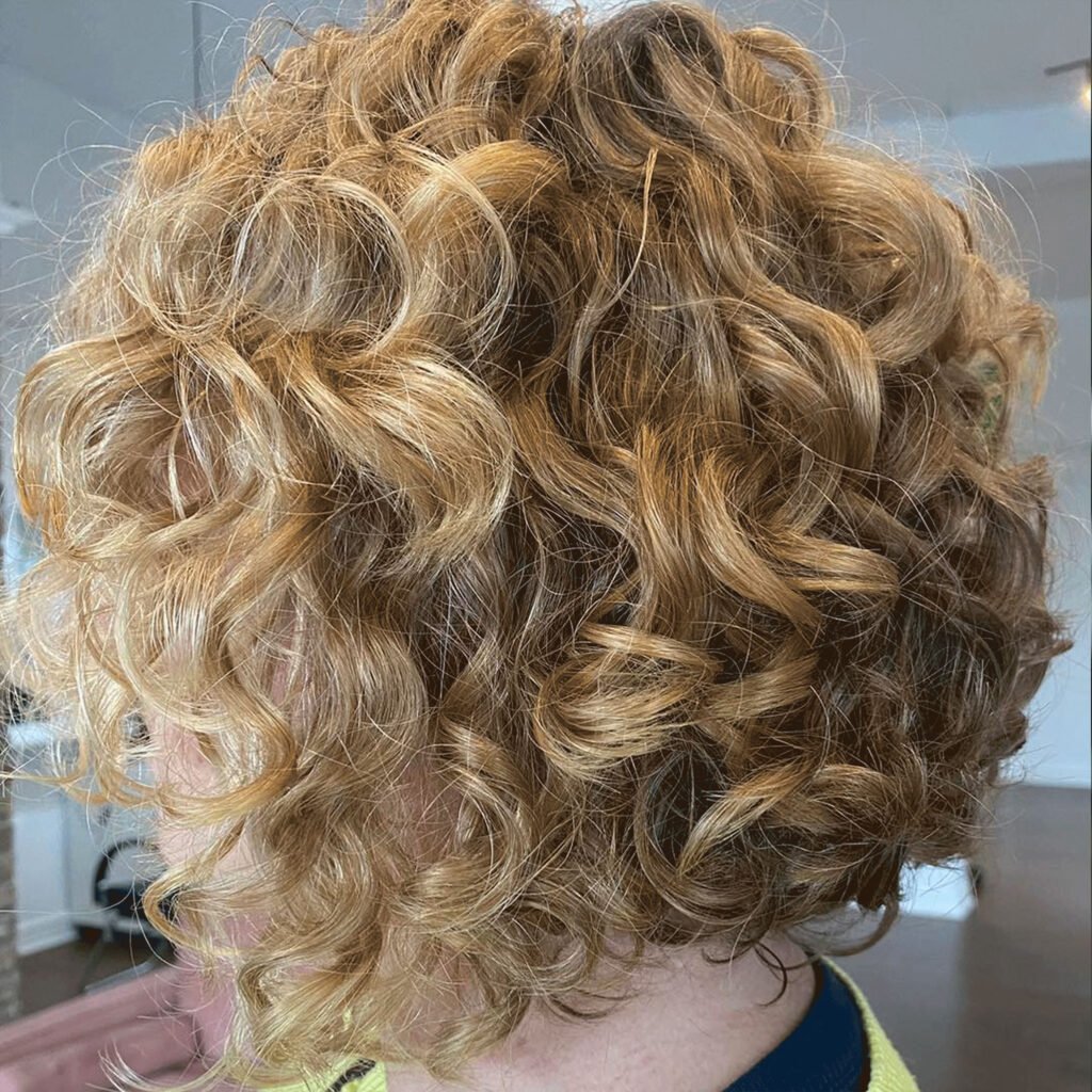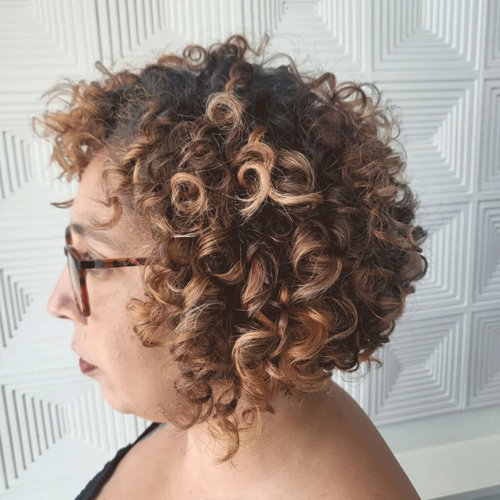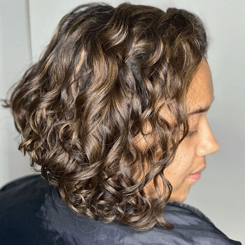 Highlights bring brightness and dimension to a curly bob, creating a fresh, sun-kissed effect. The slightly undone finish makes it playful and easy to wear.