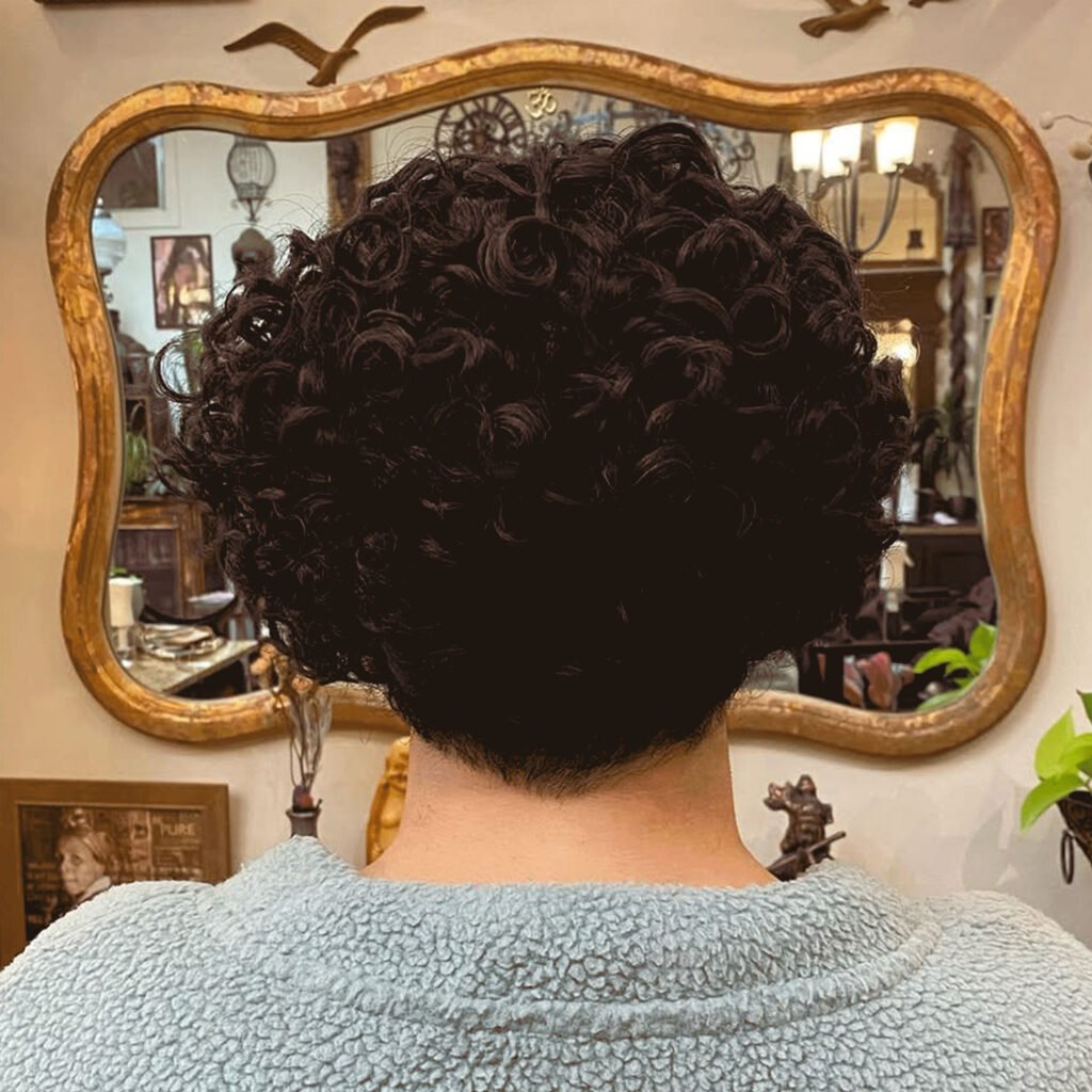It’s edgy, trendy, and high-fashion yet softened by the curls. A touch of styling gel defines the texture, making this daring look both creative and playful.