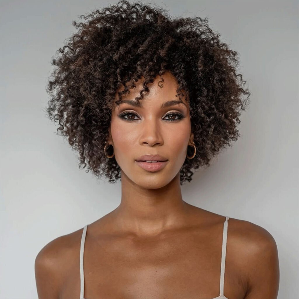 This hairstyle makes a bold statement by pairing cropped curls with tiny, sharp bangs. The short length keeps curls lively and easy to maintain, while the bangs highlight the eyes and cheekbones.