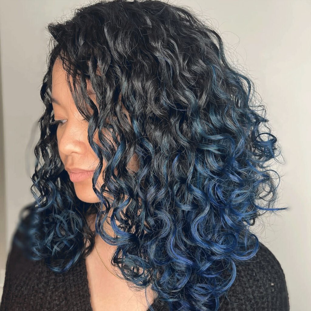 This lob blends curly texture with a striking blue ombre effect that adds depth and dimension. The smooth color transition gives it a bold, eye-catching edge while the curls soften the look.