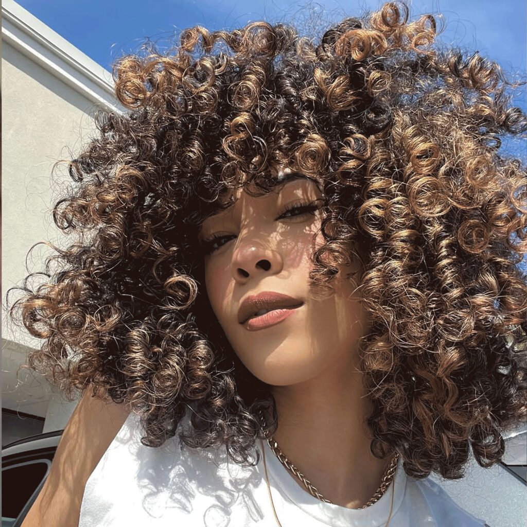 Stacked layers at the back create volume and shape, while golden tones give curls shine and depth. The structure keeps curls controlled yet bouncy.