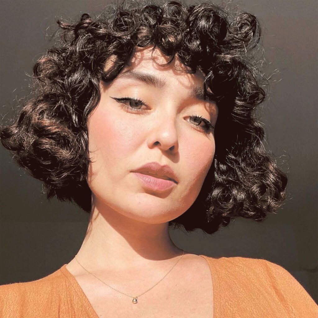 Soft bangs paired with curls create a delicate, romantic feel. The bob length makes it fresh and easy to manage.