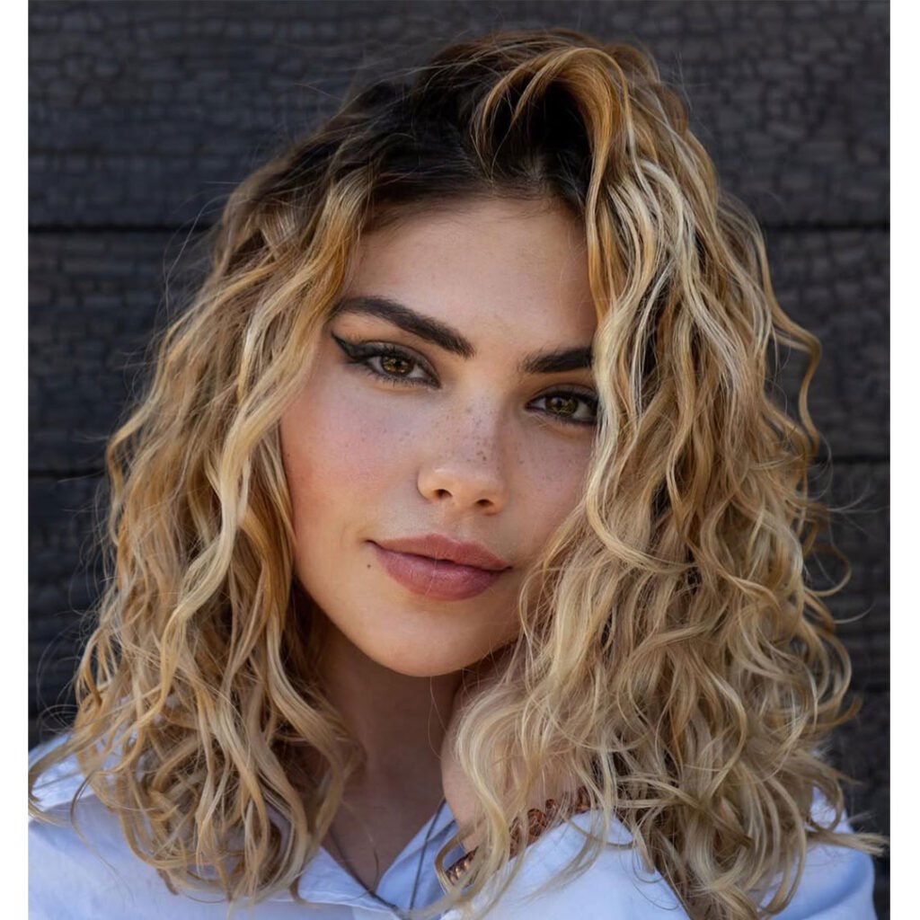 The shoulder-length cut makes it super manageable while still looking full and textured. These curls aren’t overly styled—they fall naturally and frame your face with ease. A little sea salt spray is all you need to keep this look beachy and beautiful. It’s casual confidence at its finest.