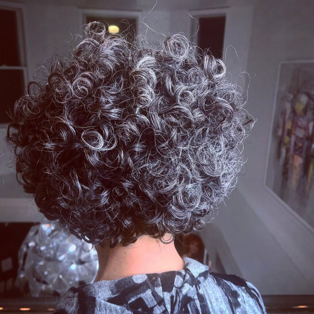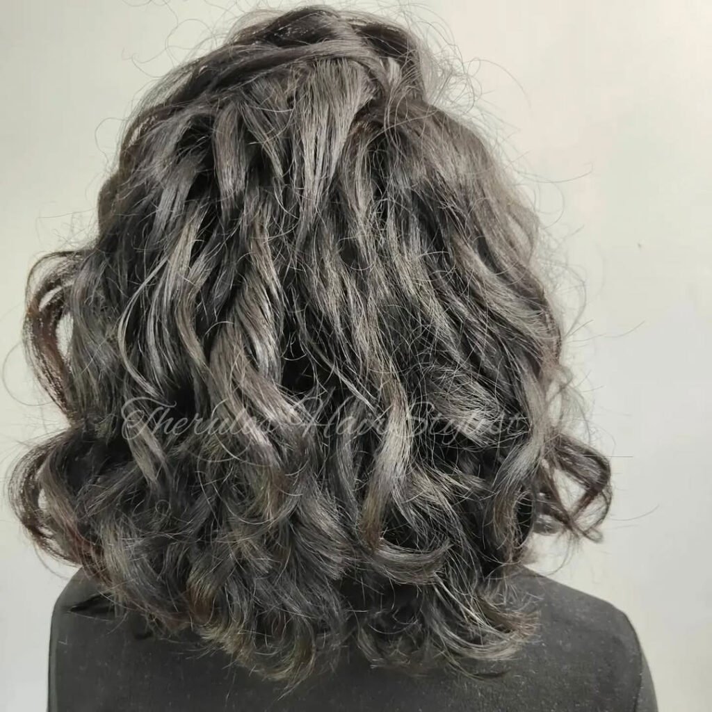 Confidence meets elegance in this salt and pepper curly bob. The natural mix of silver and dark strands gives your curls incredible depth and personality. It’s proof that embracing your grays can be just as stylish—if not more—than covering them.