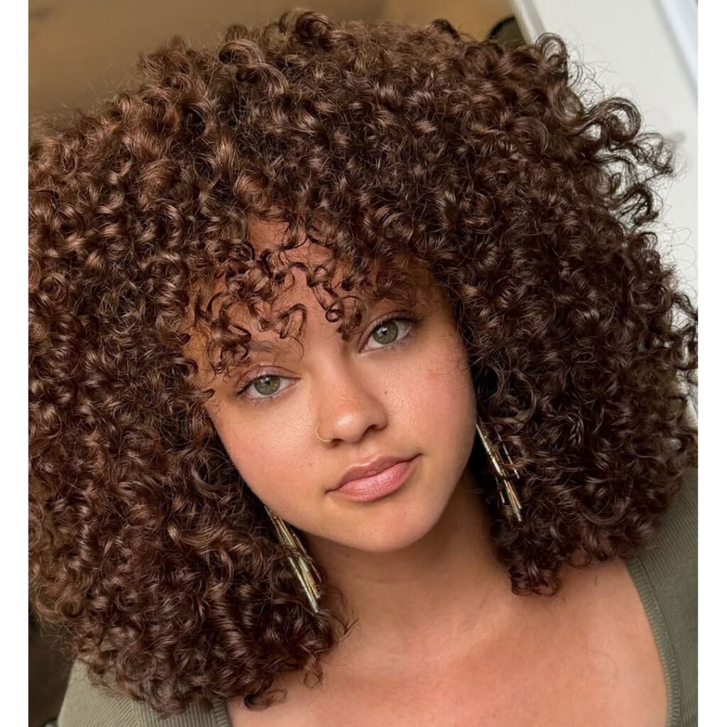 The bangs fall gently over the forehead, blending into the rest of the curls effortlessly. It’s a great option for those who want structure without sharp edges. This look is classic and sweet, with a dash of personality that makes it feel fresh every day.