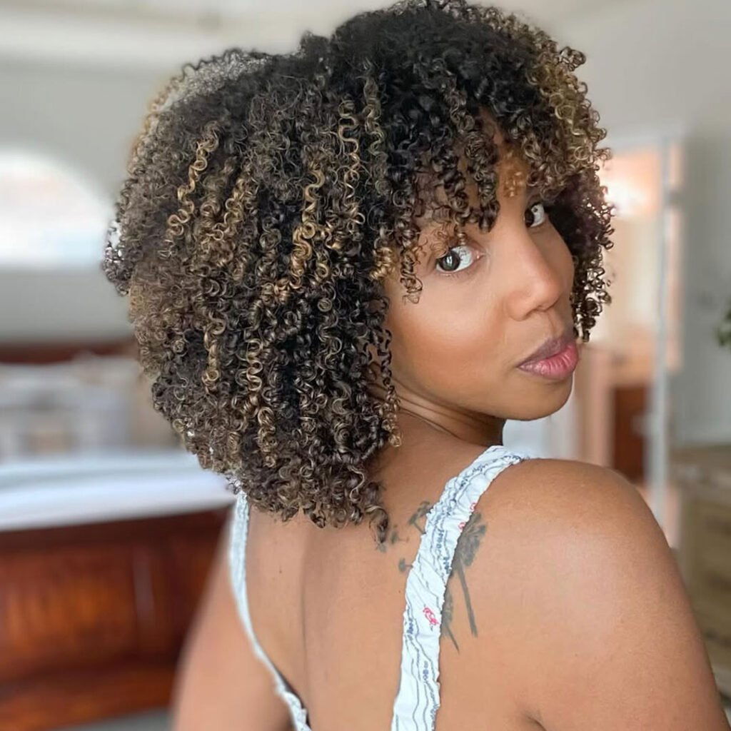 This look is all about movement and light. With layers shaping the afro and highlights dancing through the curls, it’s bold, beautiful, and full of dimension.