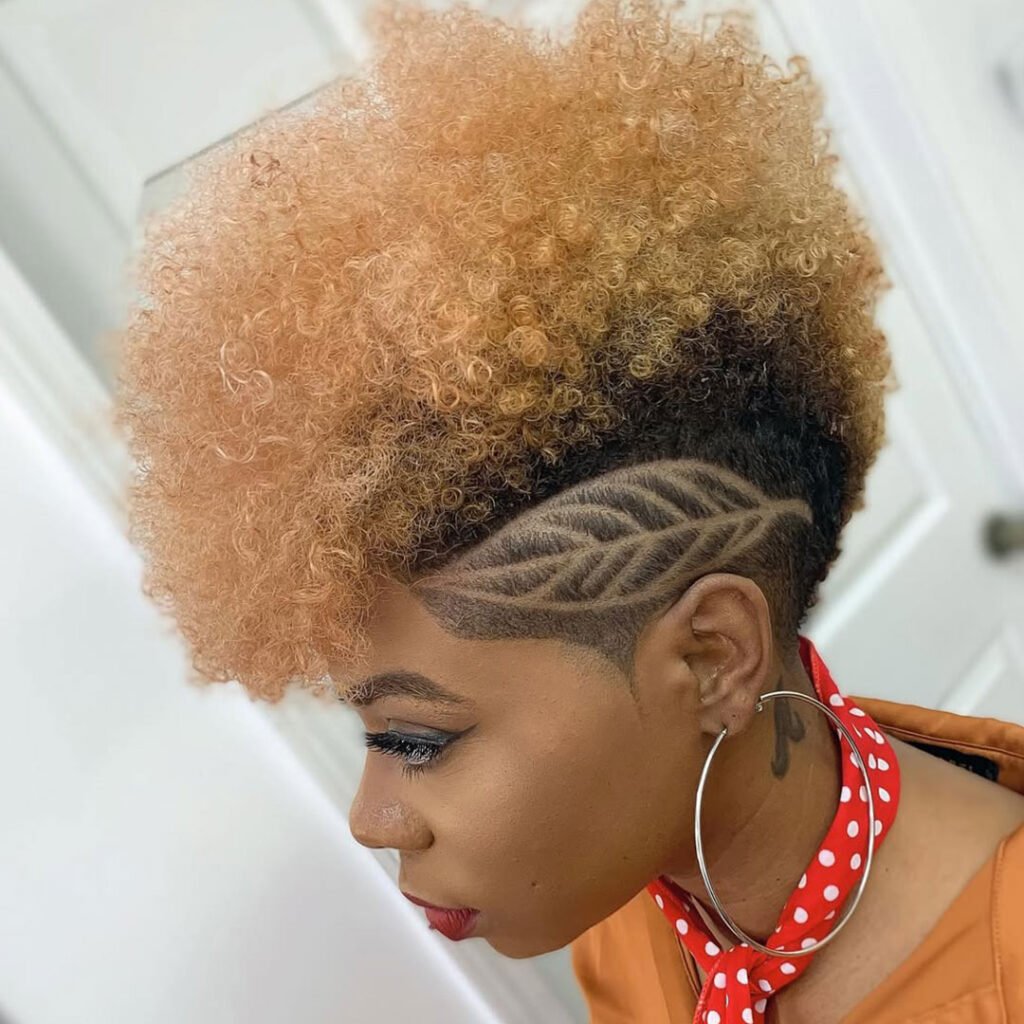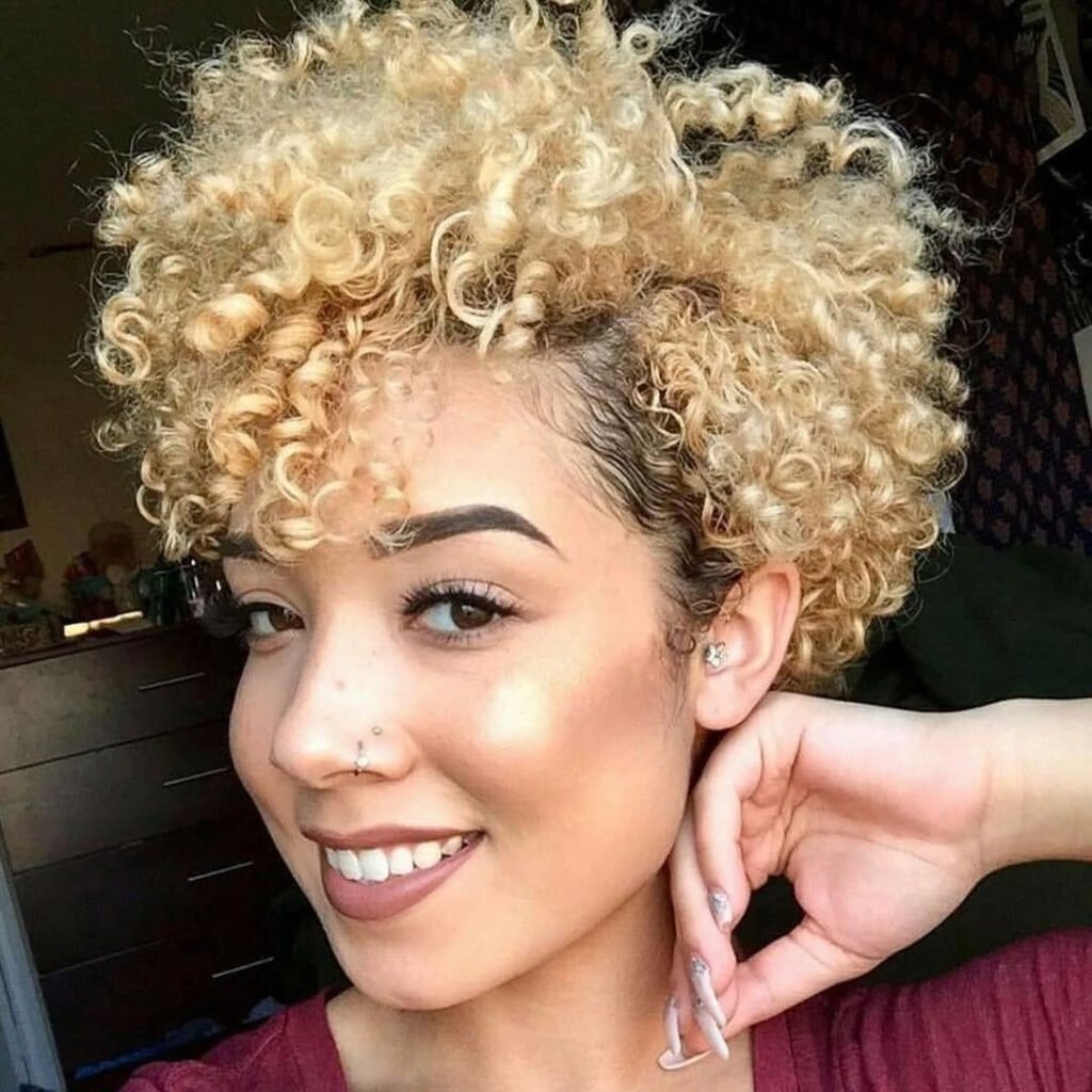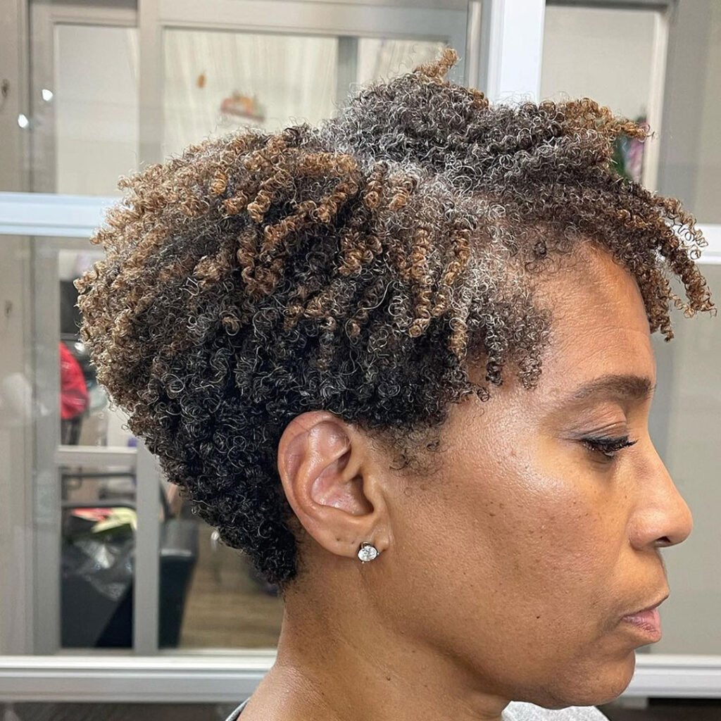 The tight curls are highlighted beautifully with the lighter tone, adding dimension and vibrancy. It’s edgy but still wearable for everyday settings.