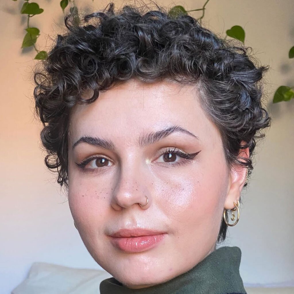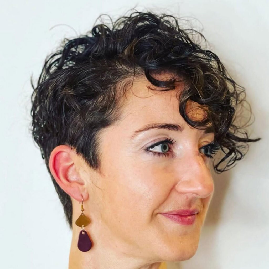 This pixie cut flips the script with a longer side that sweeps across the forehead and shorter curls on the other. It’s edgy but still soft, perfect for someone who wants a twist on the usual short style.