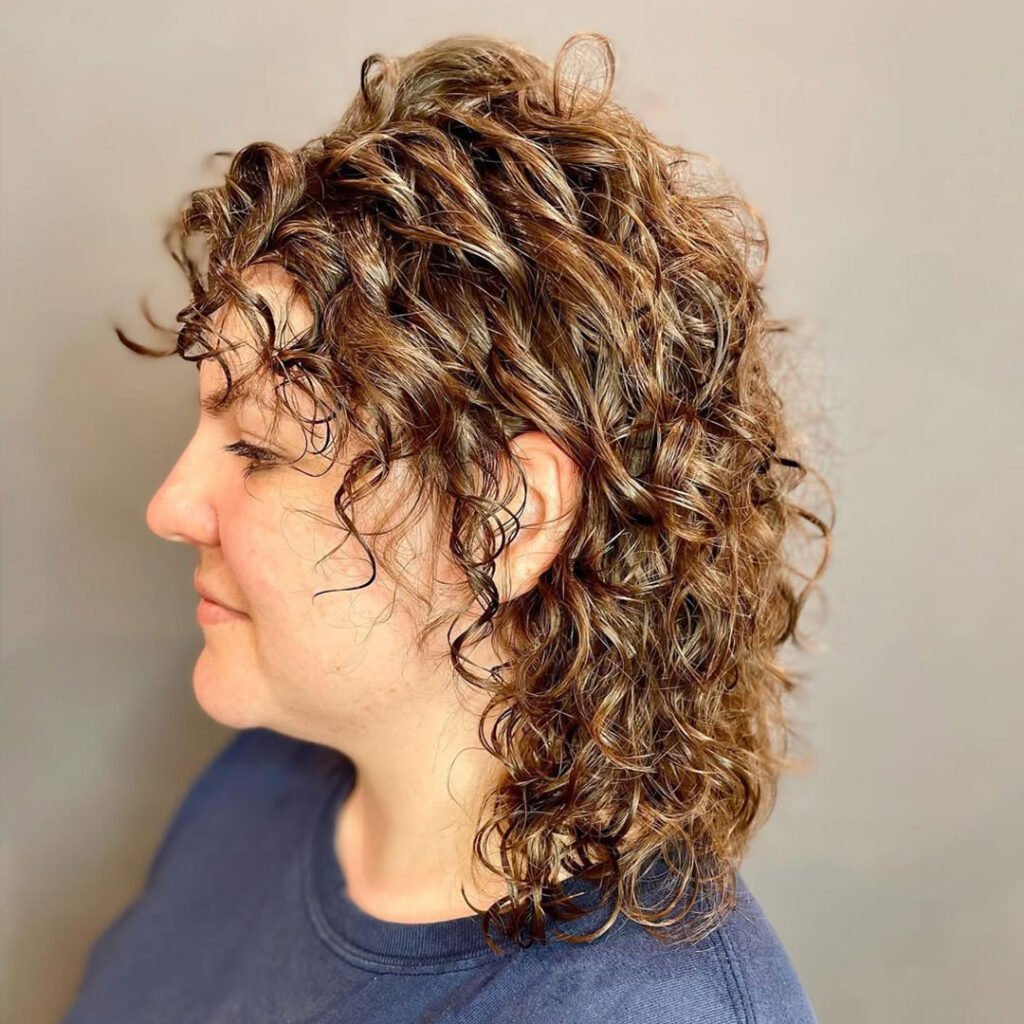 Yes, the mullet is back — and it looks amazing with curls. This version keeps things fun with tight or loose curls on top, shorter sides, and longer curls in the back.