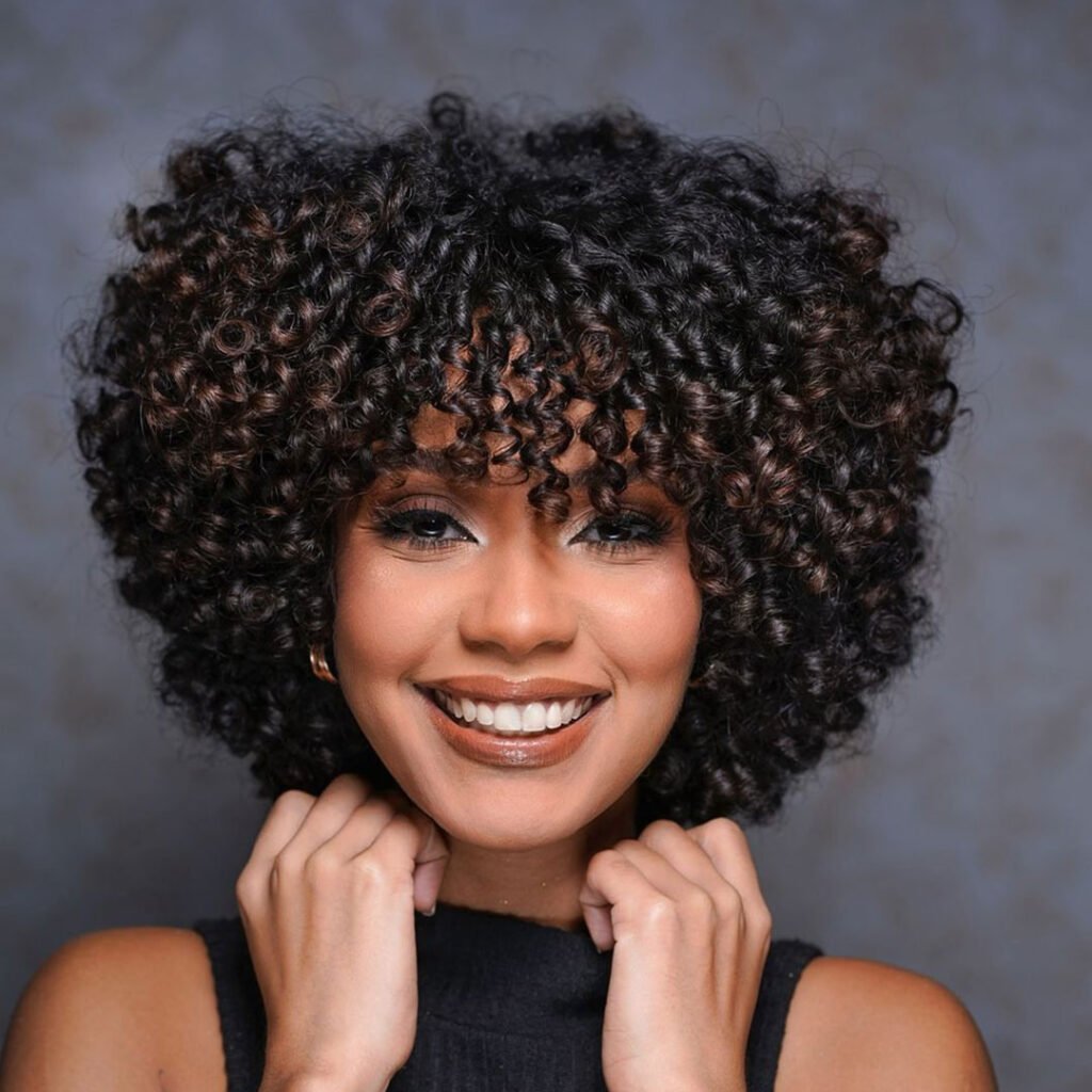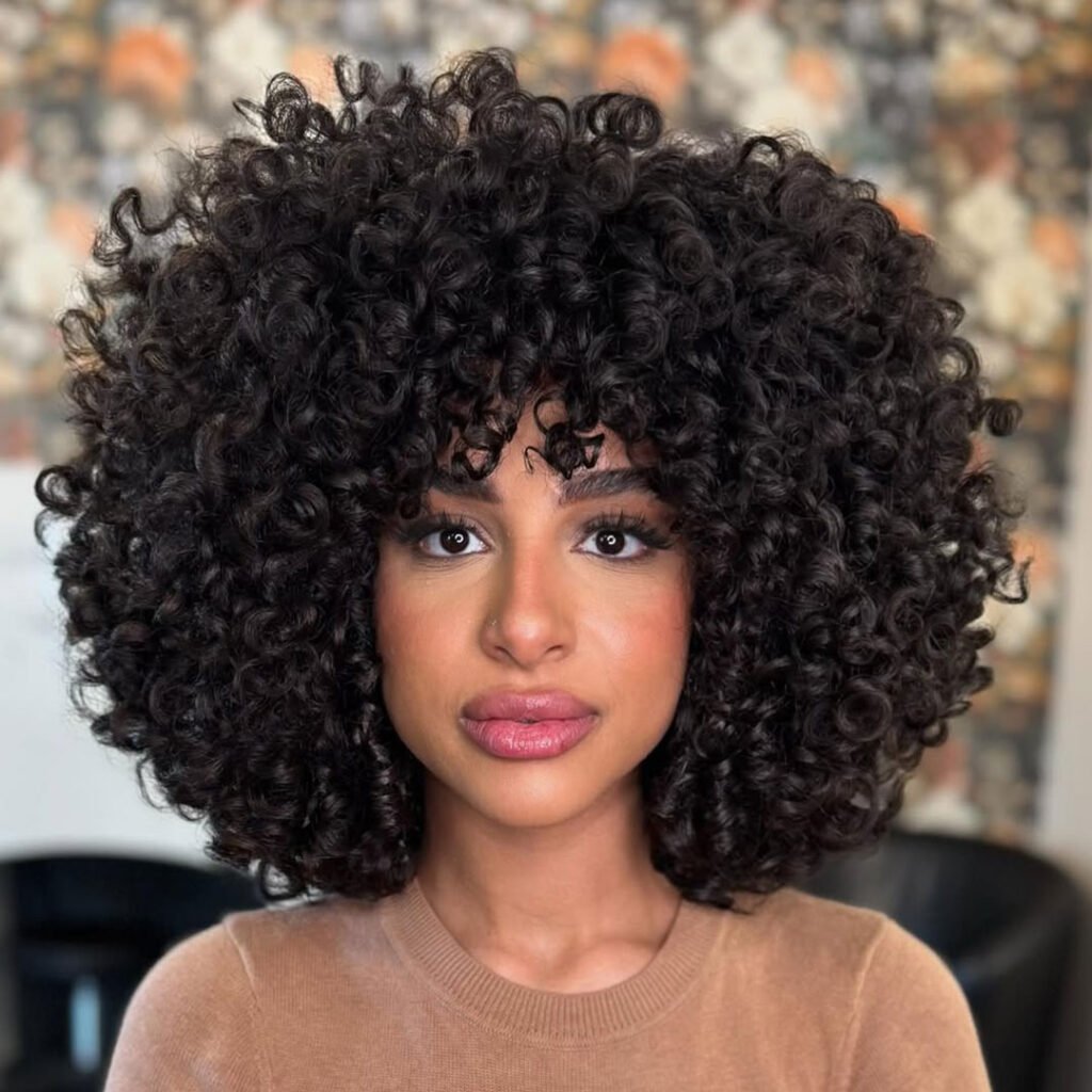 The shape hugs the head in a perfect halo of curls, while the bangs soften the forehead and bring balance to the overall look. It’s especially stunning on dense, textured curls.