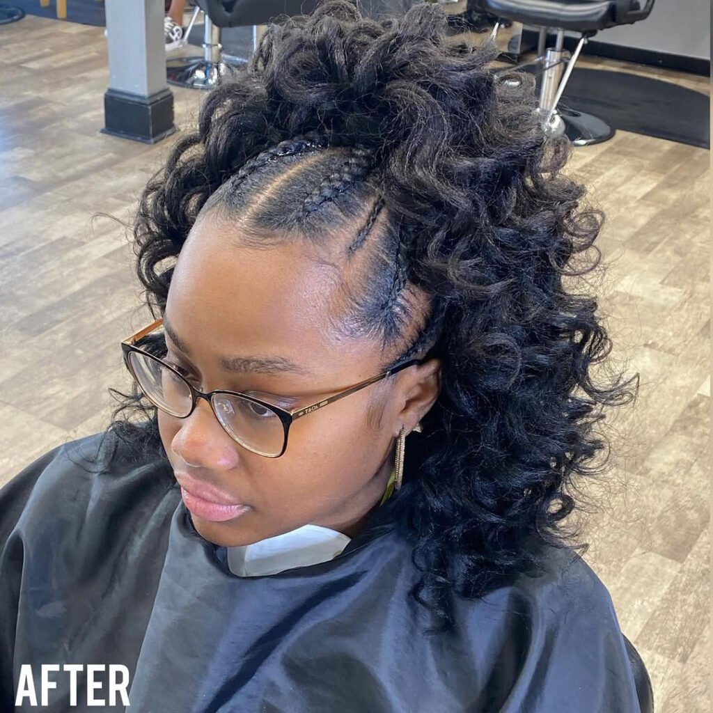 It’s a great blend of soft and bold — curls above, sleek braids below. This style keeps hair off your face while highlighting volume at the crown.