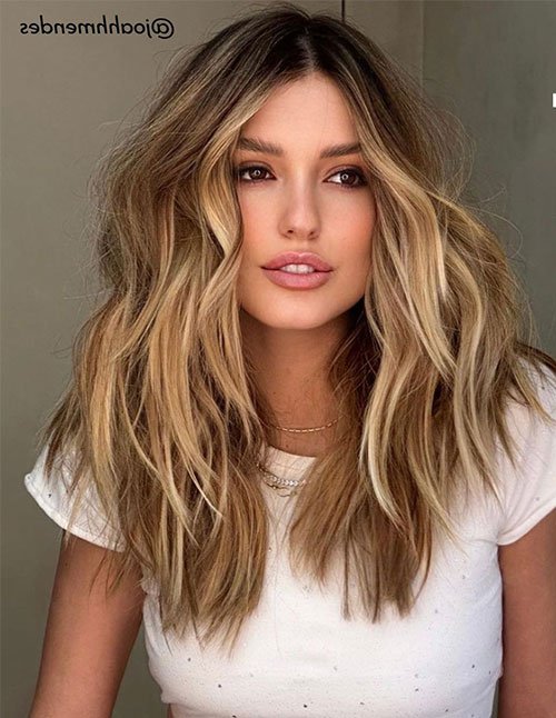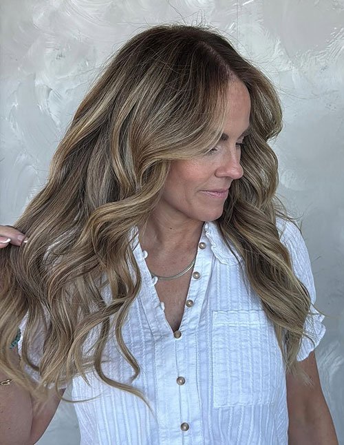 Face-framing pieces soften the perimeter and highlight cheekbones and jawlines. The layered structure supports loose waves, enhancing the contrast between lowlights and highlights. It’s ideal for clients wanting brightness with seasonal warmth and movement.