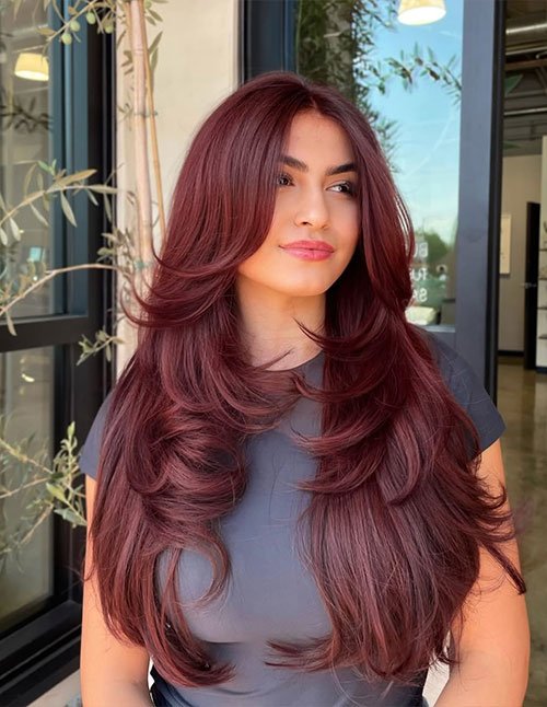 The Cherry Red Layered Cut is a bold long hairstyle that merges rich crimson tones with flowing layered shaping. The cut prevents dense color from appearing flat by introducing lift and separation. This makes the vibrant hue appear more dynamic and reflective.