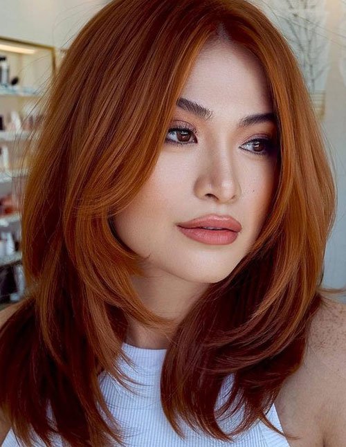 The Auburn Layered Cut pairs warm reddish-brown tones with structured medium layering. The haircut adds lift and dimension, allowing the auburn shade to catch light beautifully. It’s a classic autumn combination that feels rich and seasonal.
